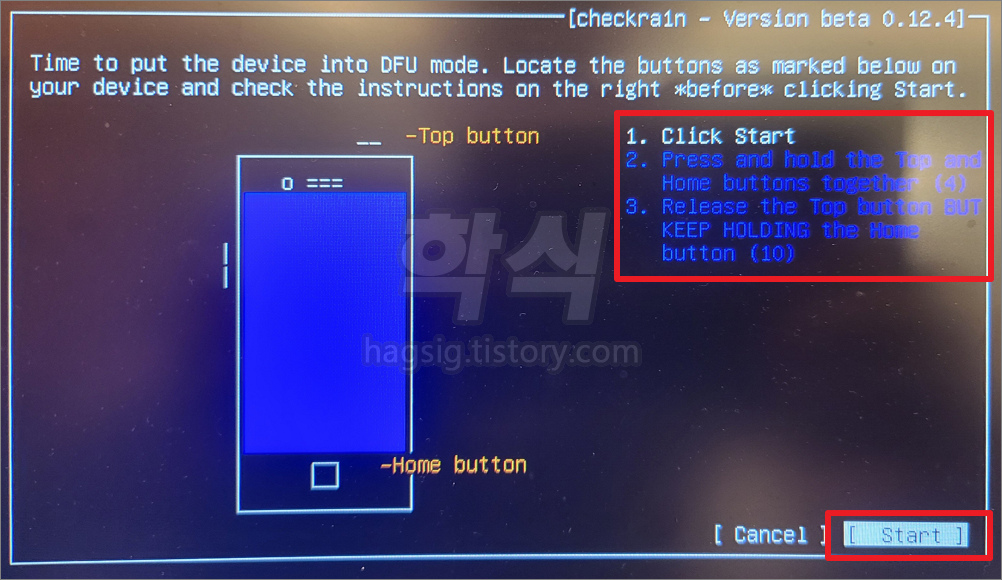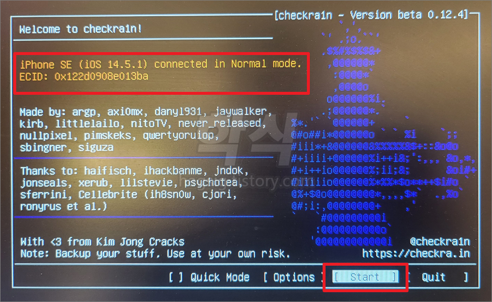 - 탈옥할 기기를 PC에 연결한 후 'Start' 버튼을 누른다.