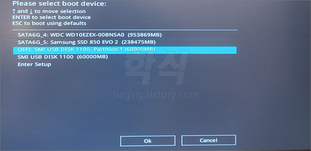 - 부팅 USB로 정상접속 될 경우 아래와 같은 화면이 출력된다.
