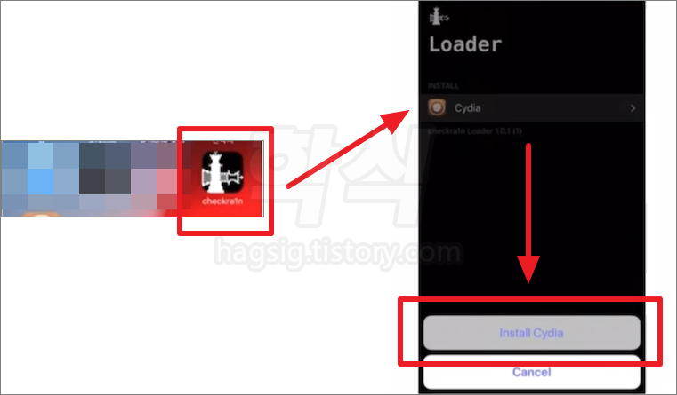 - 탈옥이 완료되면 'checkra1n' 앱이 설치되어져 있다. 앱 실행 후 'Cydia'를 클릭하여 설치를 진행한다.