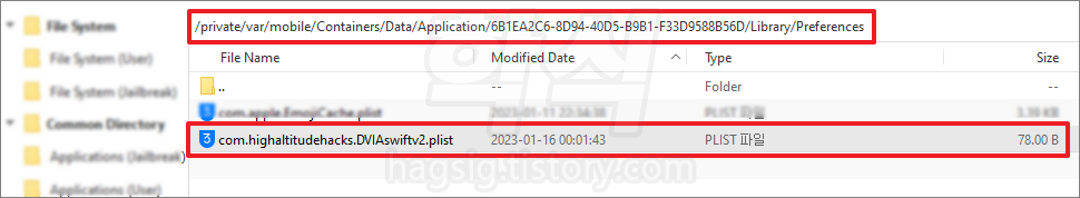 /private/var/mobile/Containers/Data/Application 에서 위에서 확인한 DVIA-v2 폴더와 수정 시간이 같은 폴더를 찾음.
