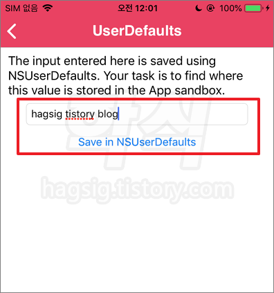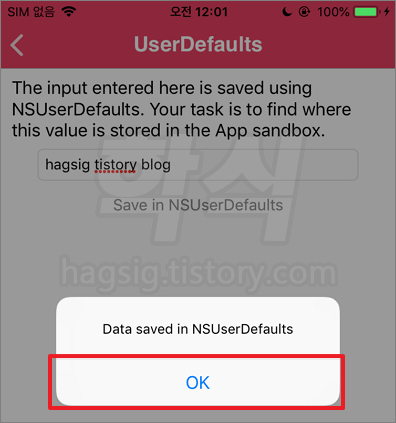 평문 저장 테스트를 위한 Text 입력 > Save in NSUserDefaults 클릭 > OK 클릭