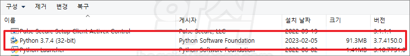 제어판 > 프로그램 및 기능 > Python [버전] 삭제