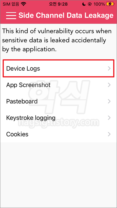 디바이스 내에 중요 정보가 로그에 남는지 확인하기 위해 DVIA-v2 앱을 실행.