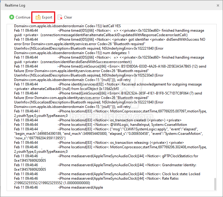 출력되는 로그를 복사하여 메모장에 붙여 넣거나 Export를 눌러 파일로 저장한다.