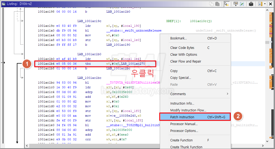 - 음영표시된 칸을 우클릭 → Patch Instruction 클릭