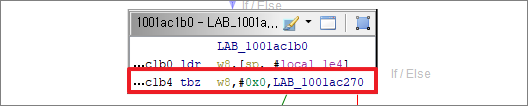 - 현재 로직을 분석해 보면 w8이 0x0일 때 LAB_1001ac270 오프셋으로 이동되도록 되어 있다.