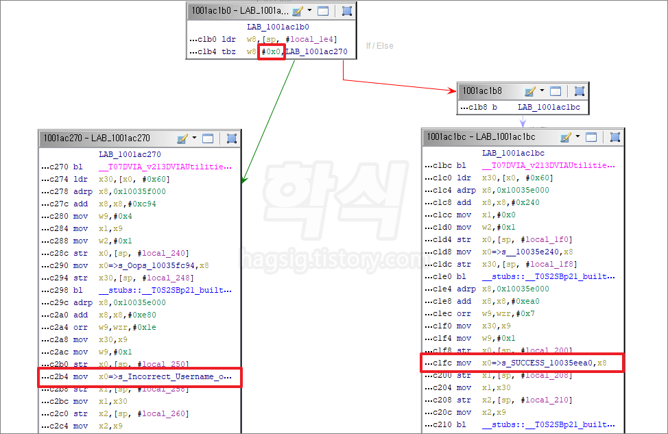 * 1001ac1bc : 성공 문구가 있는 걸로 봐서 로그인이 성공했을 때 실행되는 로직인걸 알 수 있음.