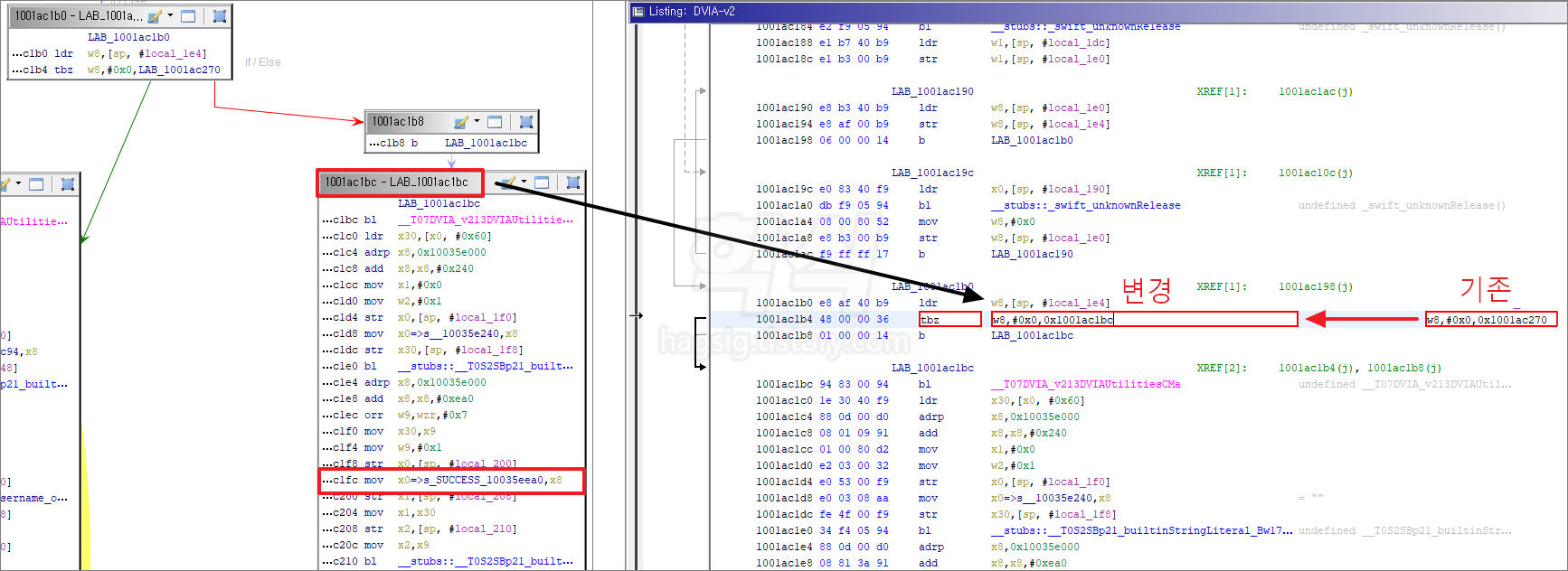 - 이경우 w8의 값을 0x0 이외의 값으로 변조하거나, w8의 값이 0x0일 때 인증이 실패했을 때 연결되는 오프셋(1001ac270)이 아닌 성공했을 때의 오프셋(1001ac1bc)으로 변경하여 주는 방법 등이 있을 것 같다.