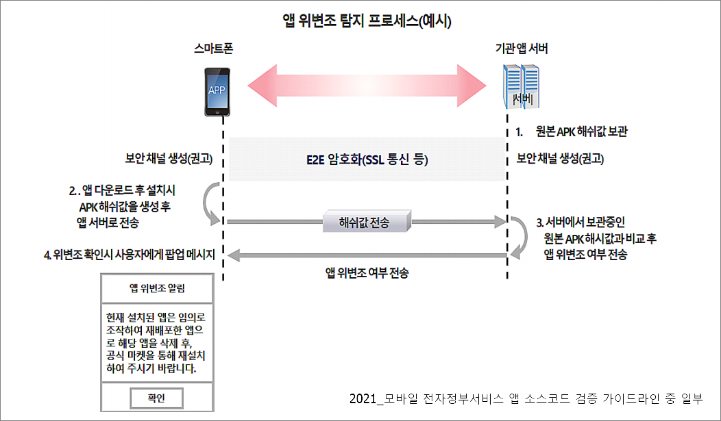 - 애플리케이션 바이너리 파일의 해시 값을 검증(코드 무결성 검증)하여 앱이 위·변조되었는지 체크한다.