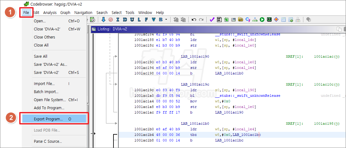- 아래의 과정을 따라하여 추출한 바이너리 파일을 기드라(Ghidra)를 통해 분석한다.