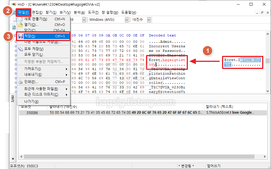 - 기존 문구를 변조하고 싶은 문구로 수정 → 파일 클릭 → 저장 클릭