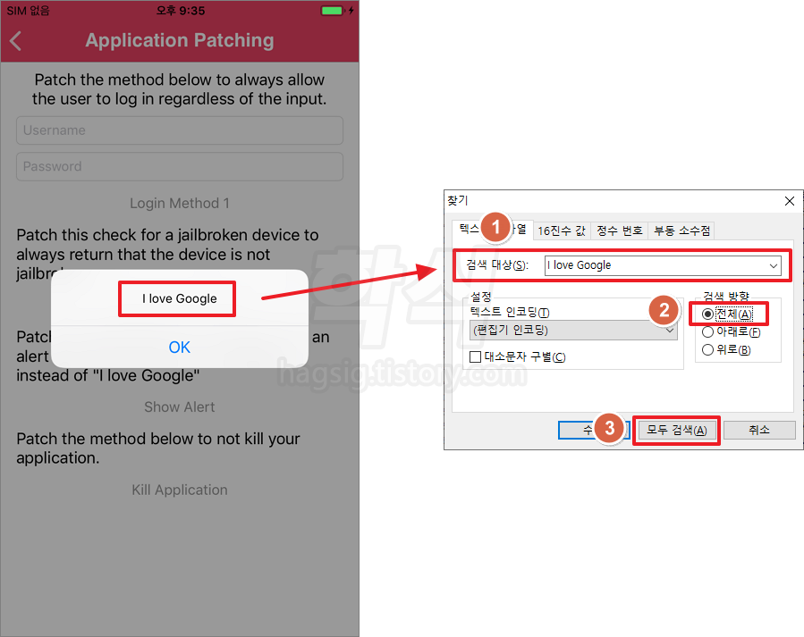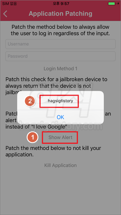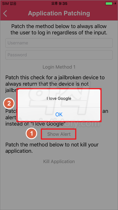 -앱을 재실행 한 뒤 다시 시도해 보면 " "I love Google"대신 변조한 문구가 출력되는 것을 볼 수 있다.