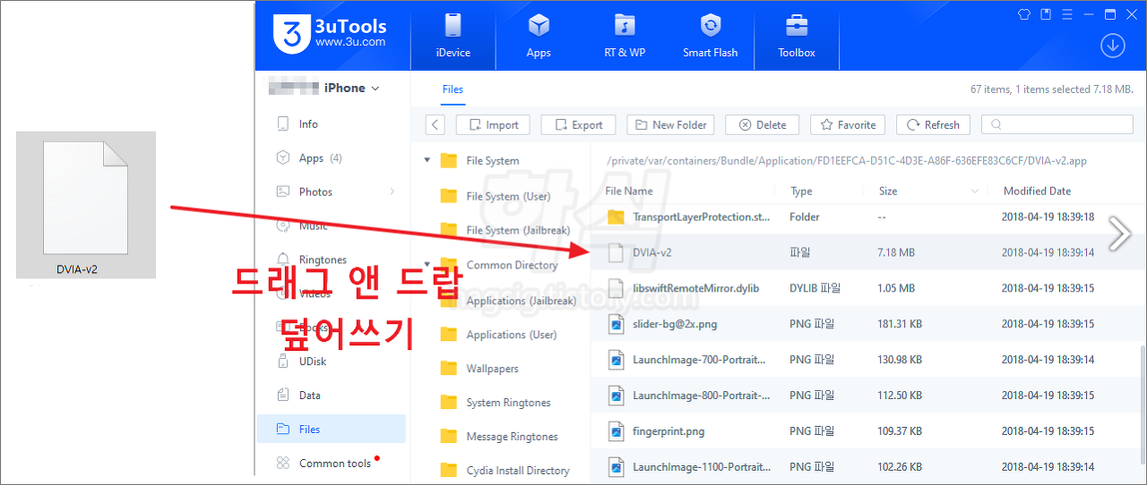 - 3uTools를 통해 앱의 바이너리 파일을 위에서 변조한 파일로 교체(덮어쓰기)