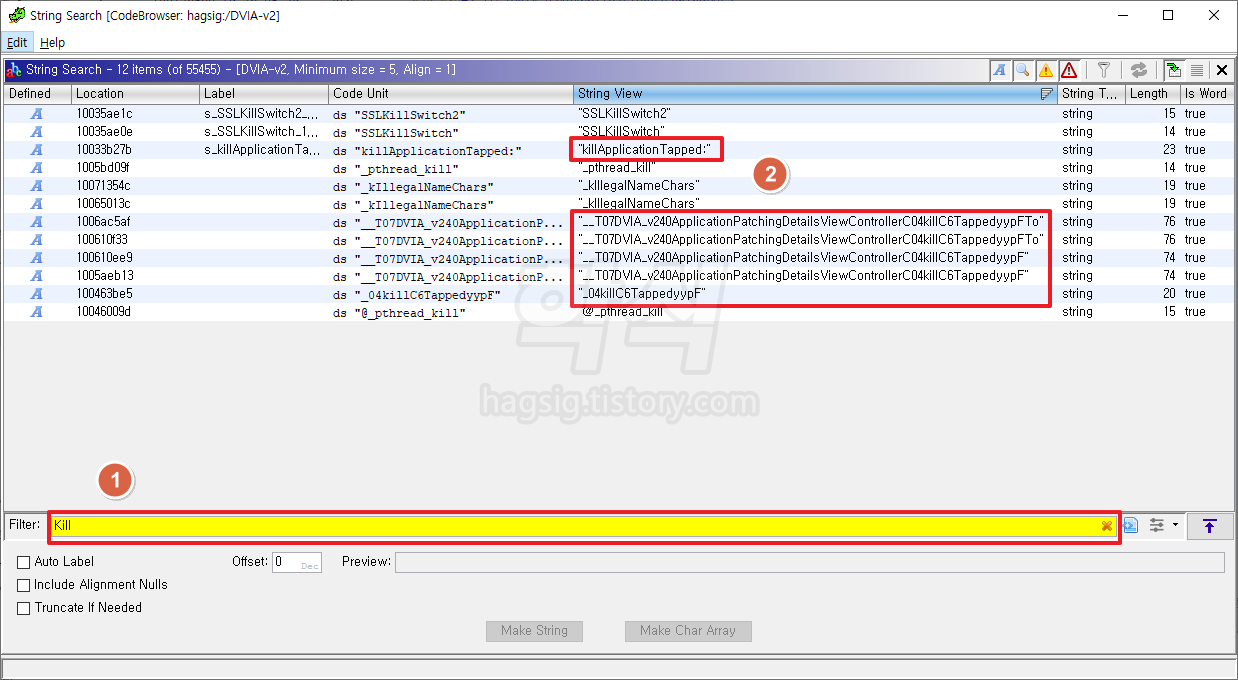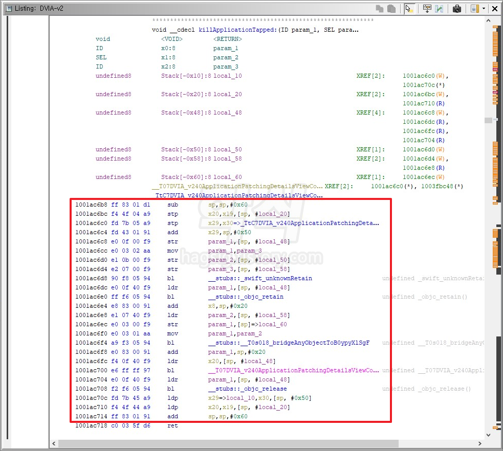 - 검색된 내용을 하나씩 확인하던 중 "__T07DVIA_v240ApplicationPatchingDetailsViewControllerC04killC6TappedyypF"함수가 강제종료 로직으로 의심이 되는 부분이 발견됨.