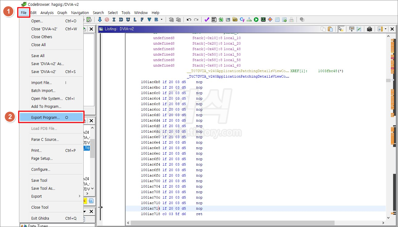 - 아래의 과정을 따라하여 추출한 바이너리 파일을 기드라(Ghidra)를 통해 분석한다.