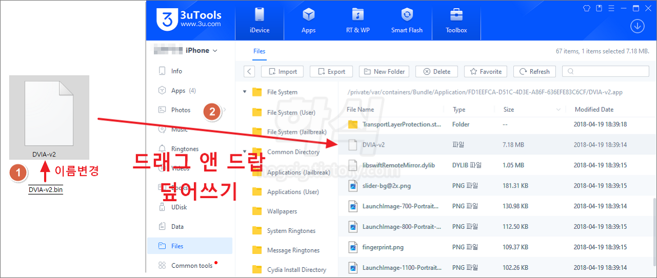 - 저장된 바이너리파일의 확장자를 삭제 → 3uTools를 통해 앱의 바이너리 파일 교체(덮어쓰기)