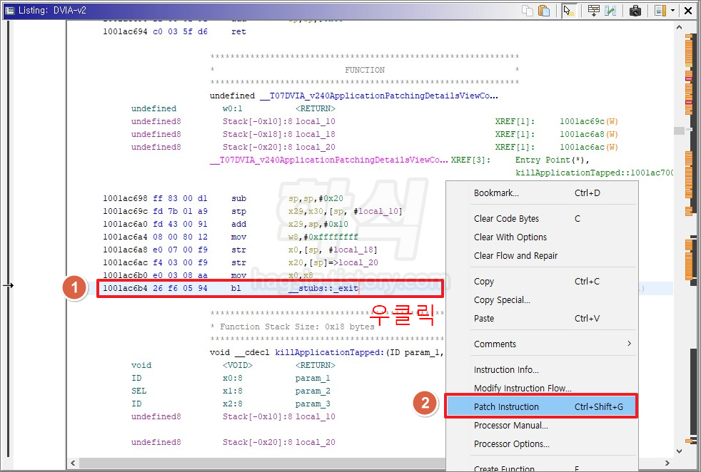 - "__stubs::_exit"가 있는 행을 우클릭 → Patch Instruction 클릭