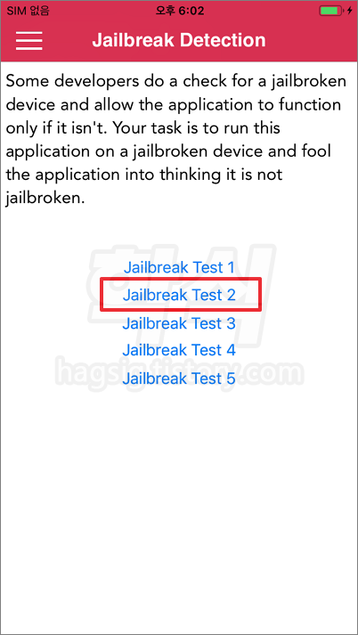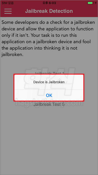 - 메인메뉴 좌측 상단 메뉴 클릭 → Jailbreak Detection 클릭 → Jailbreak Test 2 클릭