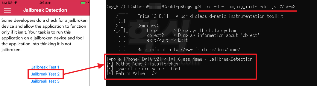 - 앱에서 Jailbreak Test 2 버튼 클릭 시 반환값이 출력된다.