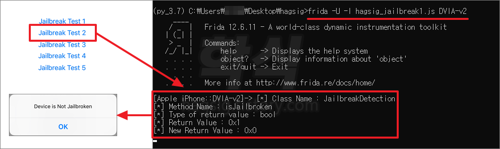 * 실무에서는 클래스 이름을 jailbreak로 하지 않았을 확률이 크므로, 결과가 나오지 않을 수도 있다. 바이너리 파일을 분석하여 추측해 내거나, 탈옥탐지 시 출력되는 문자열등을 가지고 클래스 명을 추측해 내야한다.