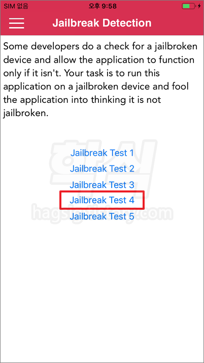- 메인메뉴 좌측 상단 메뉴 클릭 → Jailbreak Detection 클릭 → Jailbreak Test 4 클릭