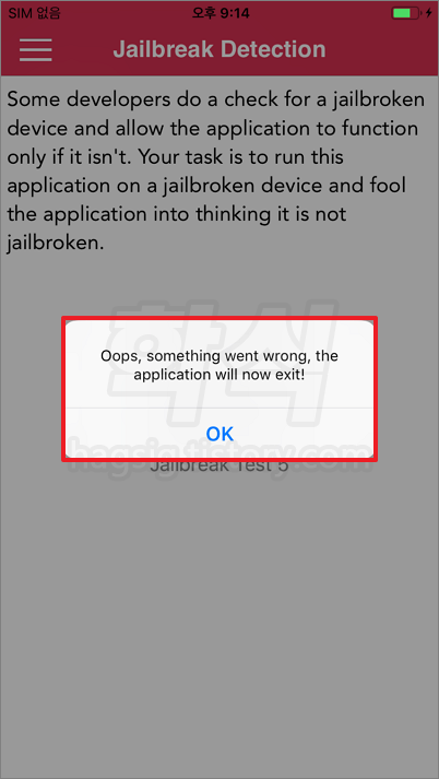 - 현재 탈옥된 기기를 사용하고 있다는 "Oops, something went wrong, the application will now exit!" 메시지가 출력되면서 앱이 강제 종료된다.
