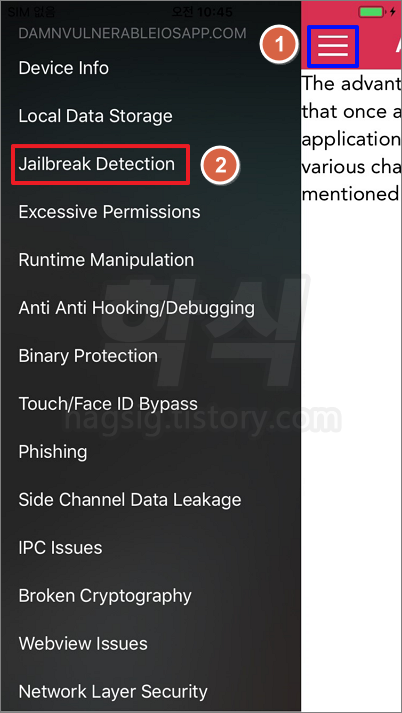 - 메인메뉴 좌측 상단 메뉴 클릭 → Jailbreak Detection 클릭 → Jailbreak Test 5 클릭