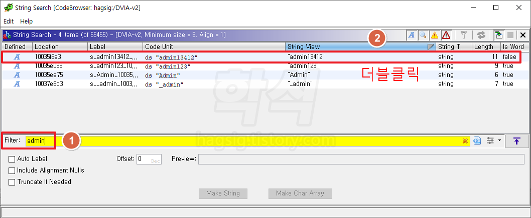 - 관리자 계정명으로 추측되는 문구를 Filter에 입력 → 검색결과 중에서 분석하고자 하는 행(아이템)을 더블클릭