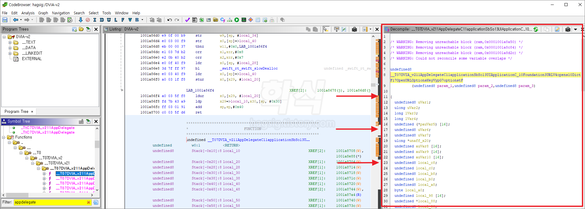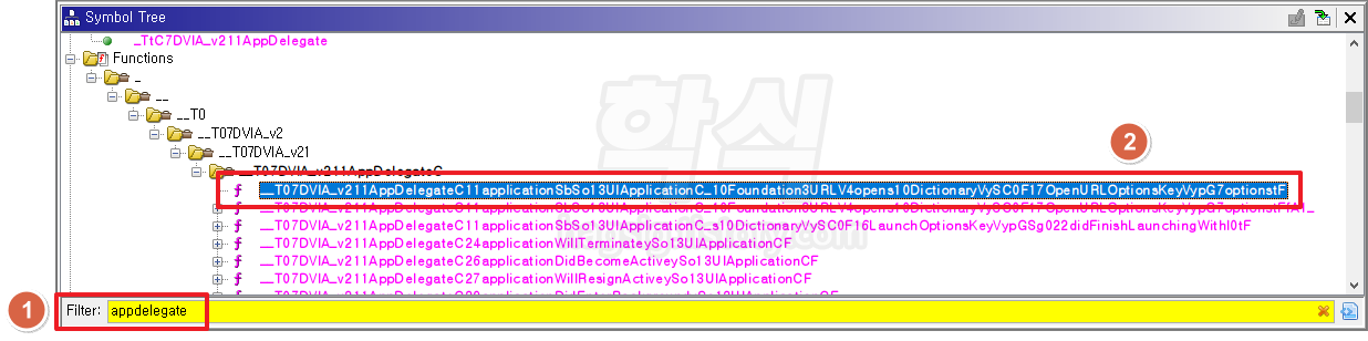 "__T07DVIA_v211AppDelegateC11applicationSbSo13UIApplicationC_10Foundation3URLV4opens10DictionaryVySC0F17OpenURLOptionsKeyVypG7optionstF" 함수(Functions)를 클릭한다.
