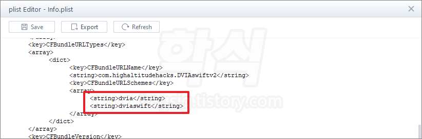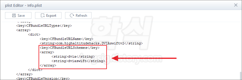 - Info.plist 중간쯤에 'CFBundleURLSchemes' 키(KEY)가 있고 스키마가 지정되어 있는 것을 확인할 수 있음.
