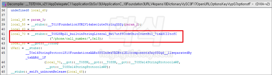 - Decompile 창의 42번 줄을 확인하면 커스텀 URL 스키마를 통해 앱을 호출할 수 있는 문구를 확인할 수 있다.