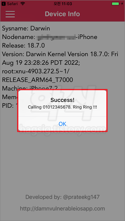 - "Success!, Calling. Ring Ring !!!"이라는 메시지가 출력되며, 커스텀 URL 스키마를 통해 정상적으로 앱 호출 및 처리된 것을 확인할 수 있다.