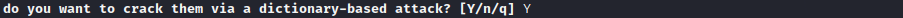 - 사전공격으로 해시값을 크랙 할지 물어보고 있다. Y를 입력한다.