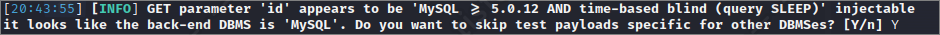 - DBMS가 MySQL인 것을 알아내었는데 다른 공격을 시도할 것인지 skip 할 것인지를 물어보고 있다. Y를 입력한다.