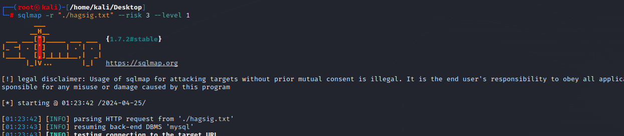 sqlmap -r "./hagsig.txt" --risk 3 --level 1