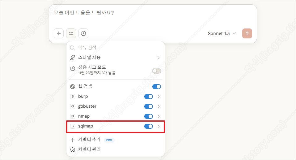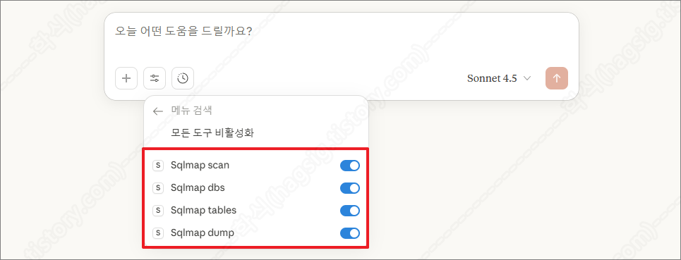 - 클로드를 종료하고 재 실행한 뒤, 아래의 사진과 같이 사용자 프롬프트에 sqlmap이라는 옵션이 생겼는지 확인한다.