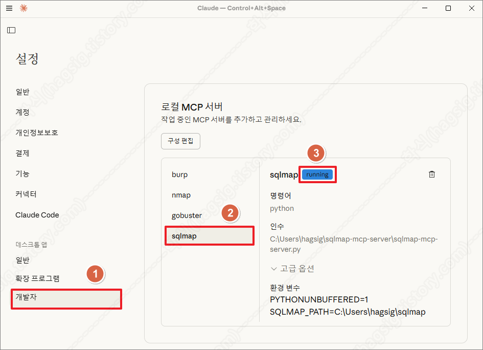 - 만약 sqlmap과 sqlmap-mcp-server.py 경로가 아래의 설정과 다르다면 변경해야 한다.
