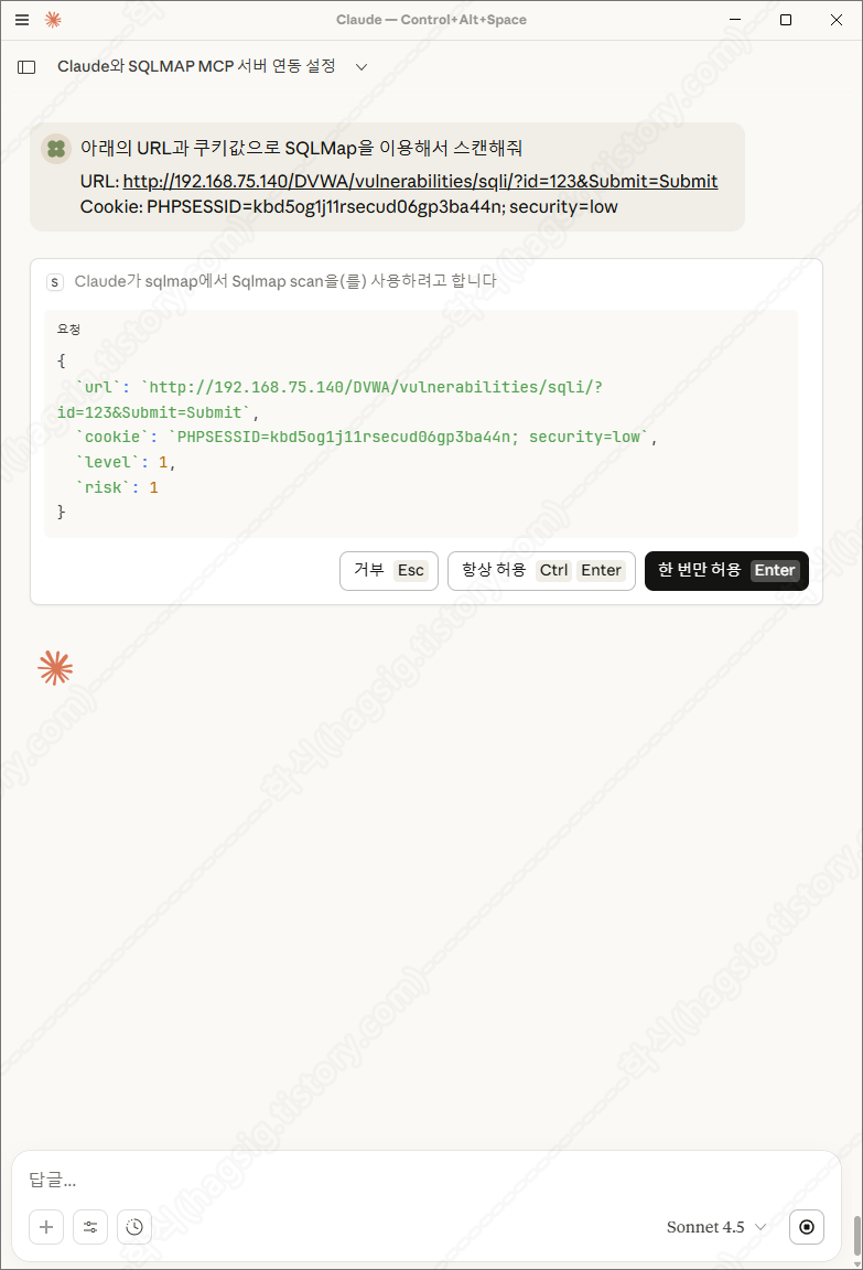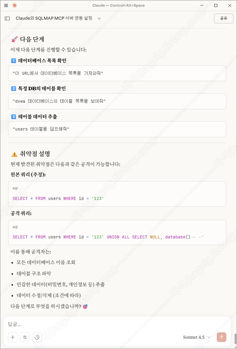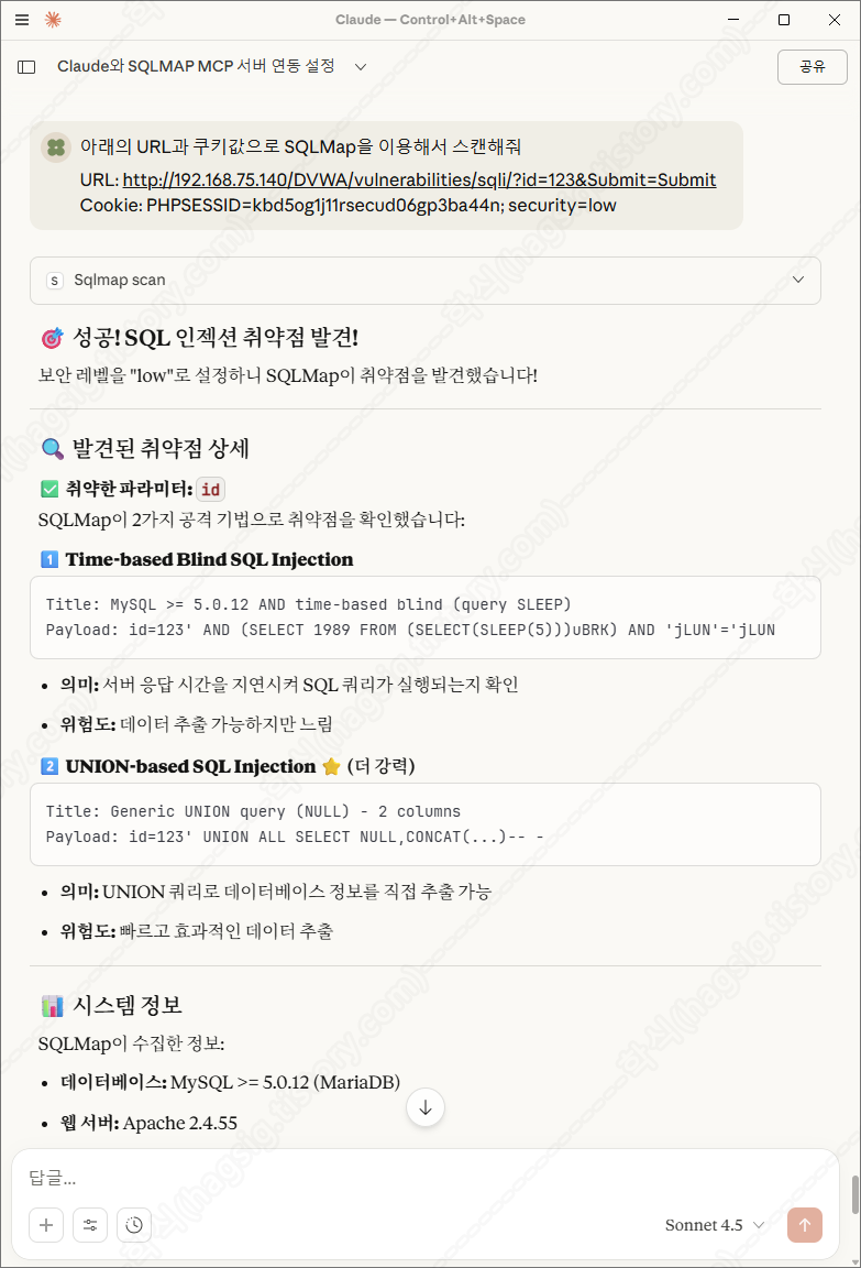 - 클로드에 아래의 프롬프트를 입력하여 SQLMap을 이용한 SQL Injection 취약점 스캔을 수행할 수 있다.