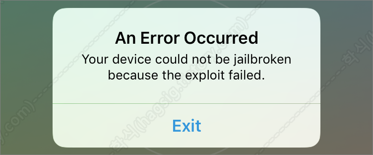 ※ 만약 2차 시도에서 아래의 사진과 같이 "An Error Occurred", "Your device could not be jailbroken because the exploit failed." 오류 팝업이 출력된다면 아래와 같은 방법으로 해결할 수 있다.