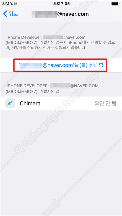 - 아래 방법대로 개발자 인증서(프로파일)를 신뢰하도록 설정하여 Chimera를 정상 실행할 수 있게 한다.