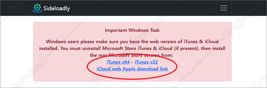 - Sideloadly가 모바일 기기를 인식하기 위해서는 Microsoft Store 버전이 아닌, Windows 설치형 실행 파일(.exe)로 설치된 iTunes(아이튠즈)와 iCloud(아이클라우드)가 필요하다.