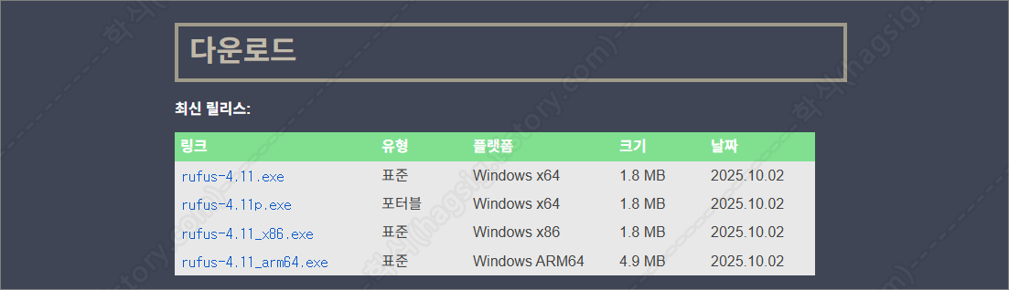 - 아래의 링크에 접속하여 Rufus를 다운로드한다.