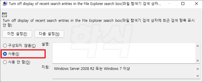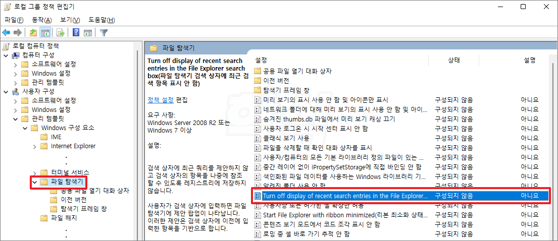 "사용자 구성"> "관리 템플릿"> "Windows 구성 요소"> "파일 탐색기" 를 누르고 "Turn off display of recent search entries in the File Explorer search box(파일 탐색기 검색 상자에 최근 검색 항목 표시 안 함)"를 더블클릭 한다.