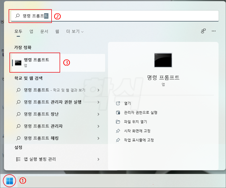 윈도우키 또는 윈도우 버튼을 누르고 '명령 프롬프트'를 검색하여 나온 앱을 실행시킨다.