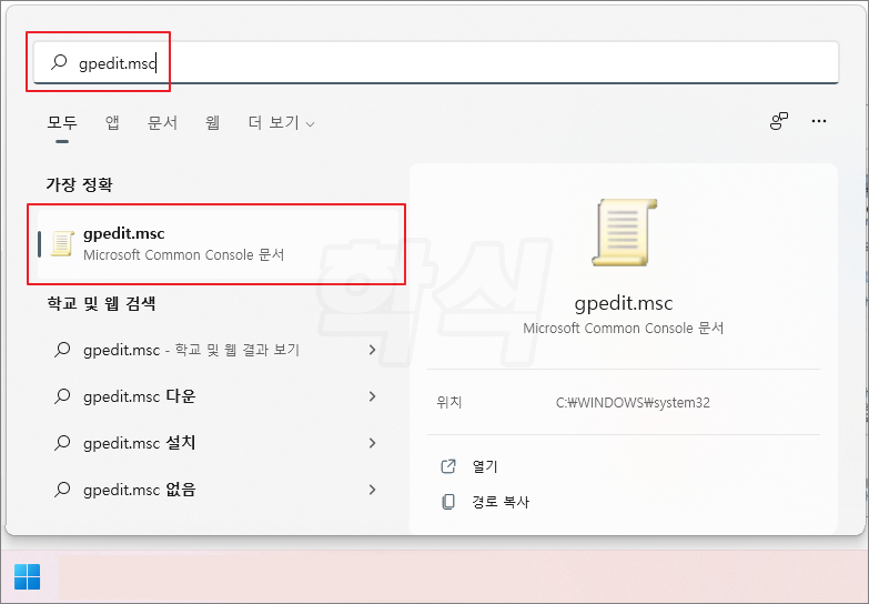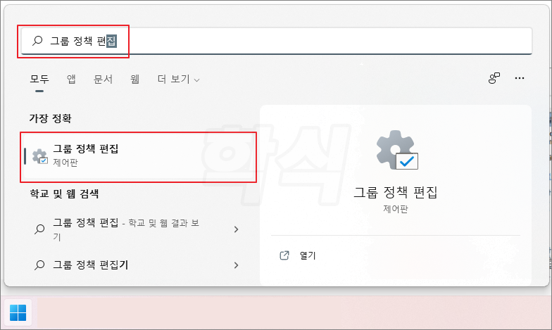윈도우키 또는 윈도우 버튼을 누르고 "그룹 정책 편집" 또는 "gpedit.msc"를 검색하여 나온 앱을 실행시킨다.