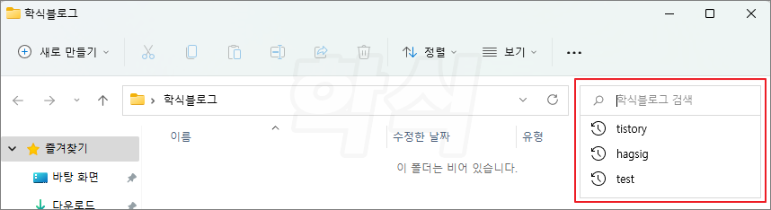 위와 같이 윈도우 탐색기를 이용해 검색할 경우 기록이 남게 되는데 아래와 같은 방법으로 삭제 및 다시는 기록이 남지 않도록 조치할 수 있다.